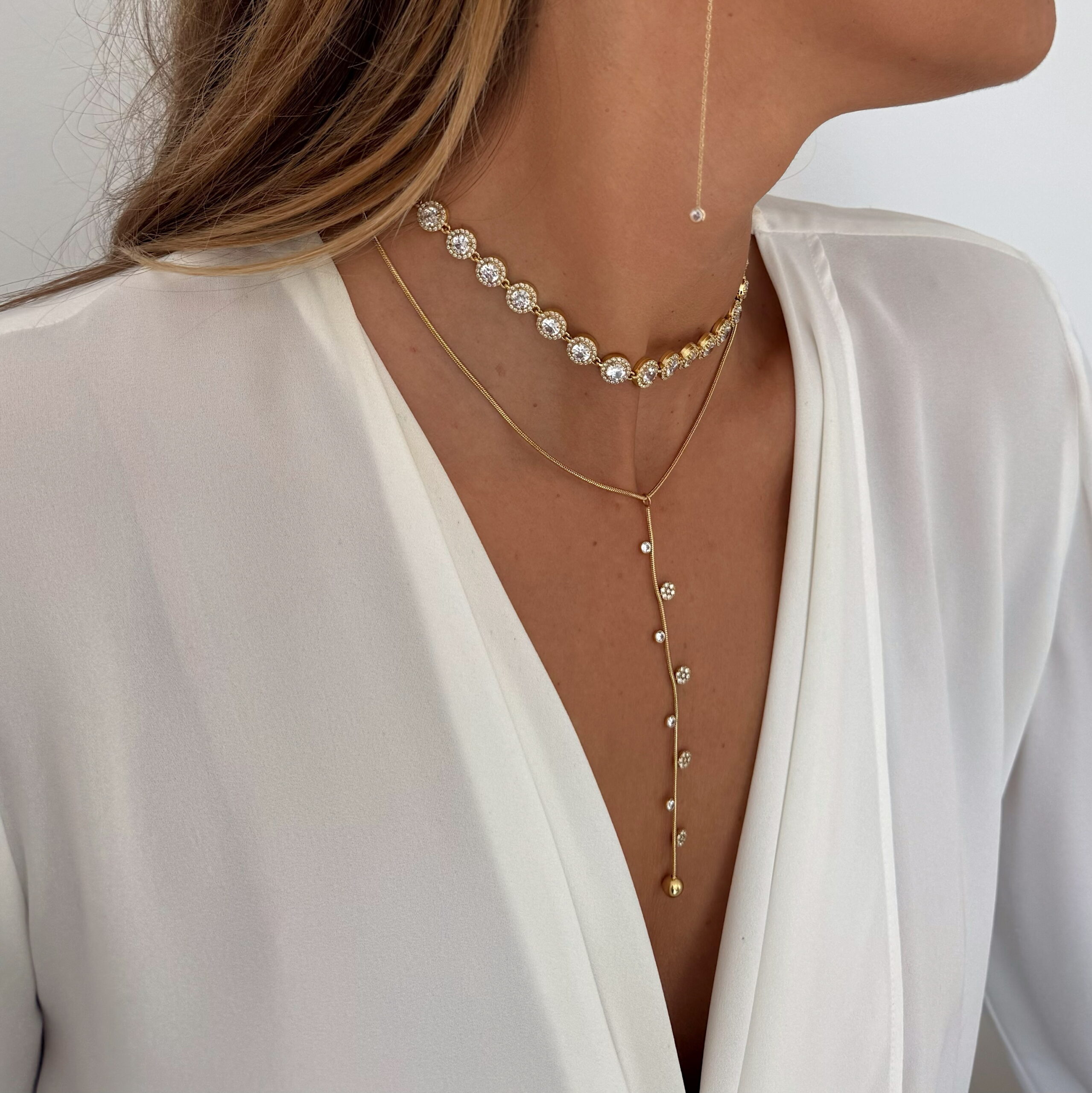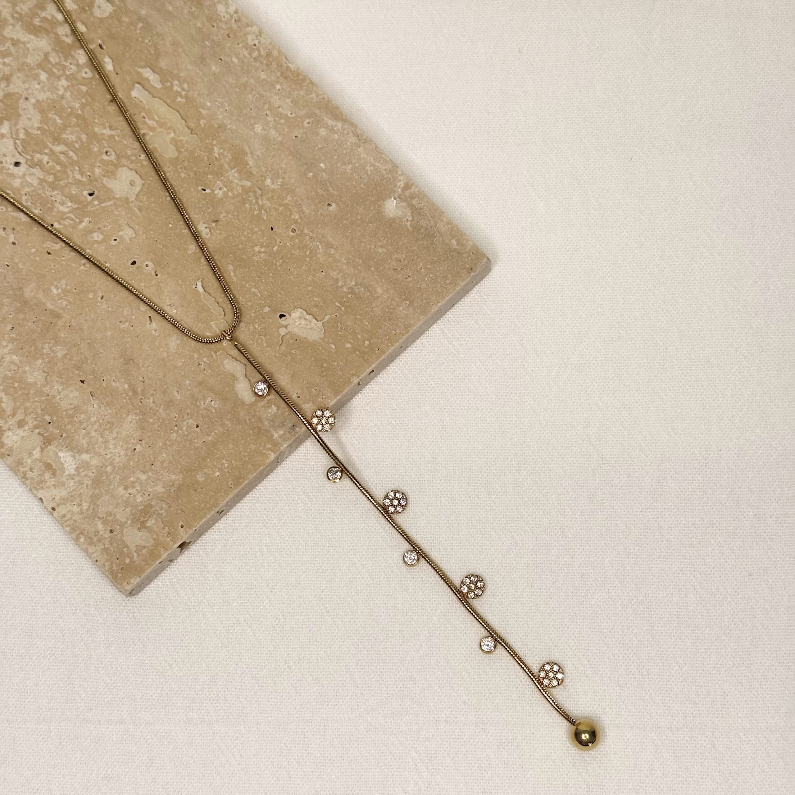 Collar en acero inoxidable dorado, elegante y resistente. Su fino diseño de cadena con circonitas blancas aporta un toque sofisticado y versátil, perfecto para cualquier look.