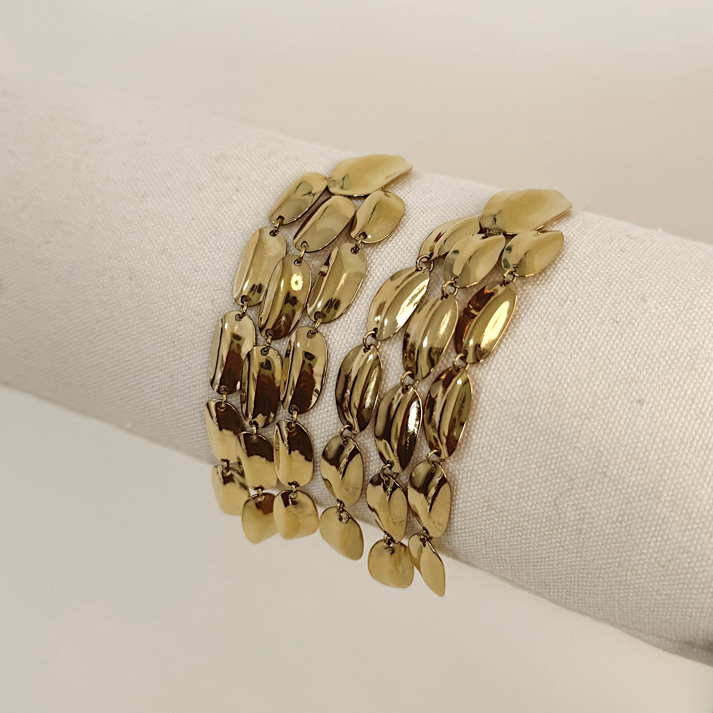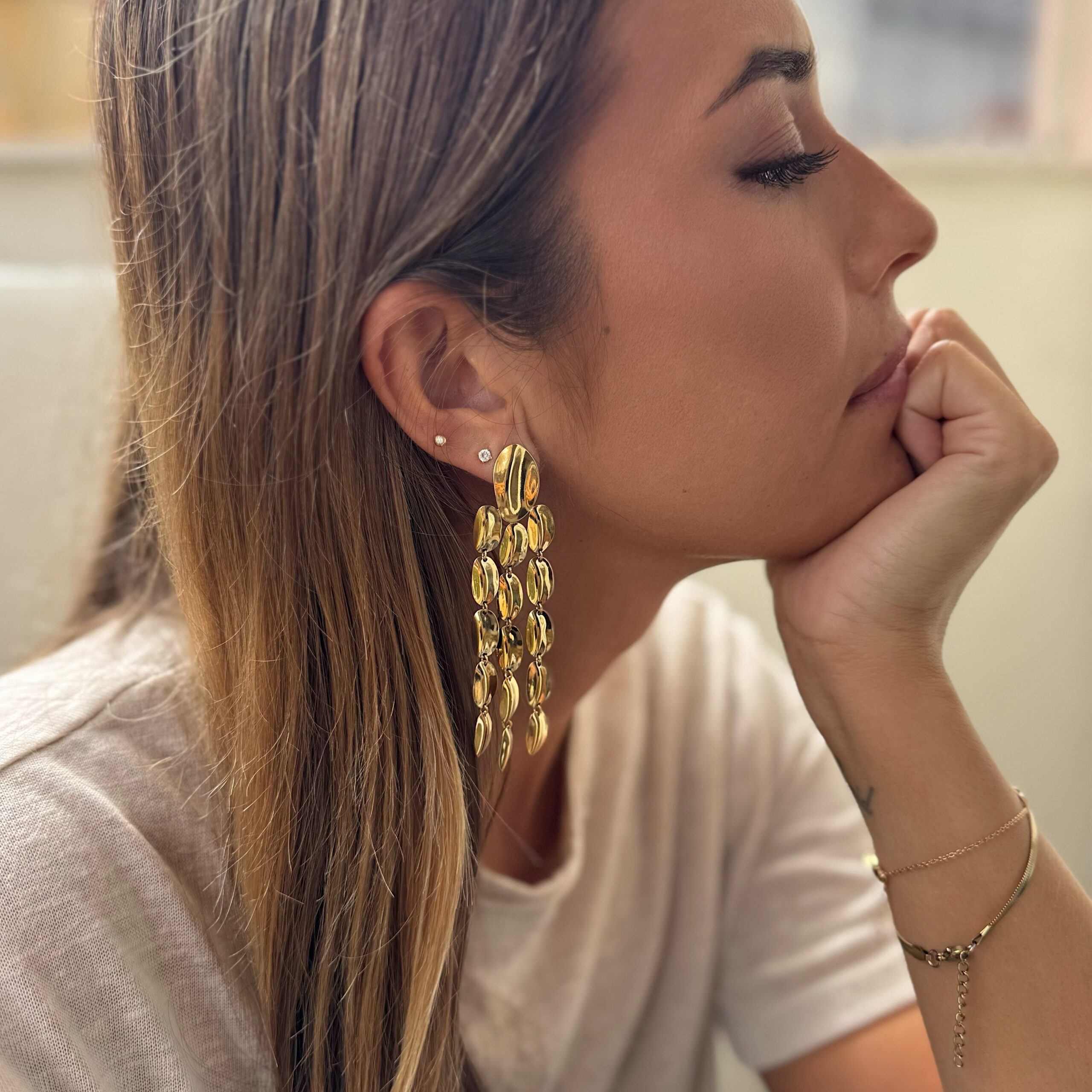 Pendientes largos en acero inoxidable con acabado dorado, elegantes y resistentes al agua. Su diseño colgante aporta movimiento y un toque sofisticado a cualquier look.